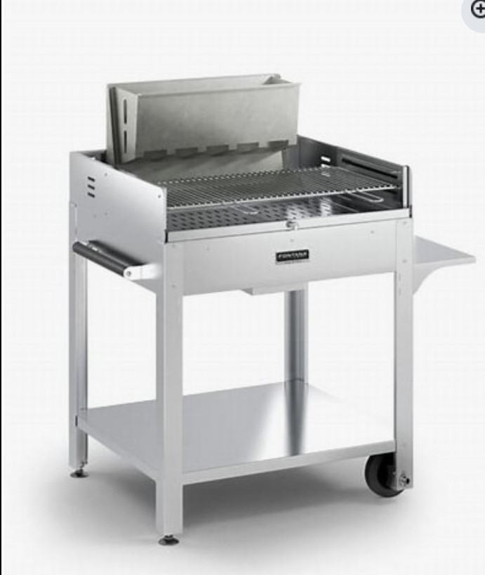 Barbecue Tirreno fontana forni 2522  interamente in acciaio inossidabile dotato di ruote per una facile movimentazione griglia di cottura cm 80×40 ha 2 posizioni si può alimentare a legna o a carbone.