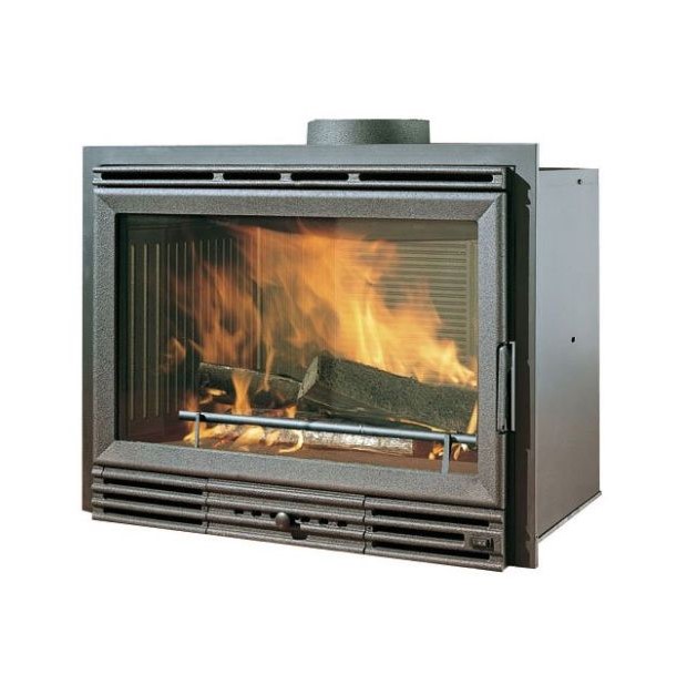 Inserto a legna, monoblocco con vetro piano,  rapida istallazione, facile da rivestire, funzione : ventilazione forzata. Potenza termica 9,6 KW. Rendimento 89,5 %. MC riscaldabili 250.  Classificazione 4 stelle. Non idoneo al conto termico. Mis.H cm 54. L cm 76. P cm 45.Peso Kg 153